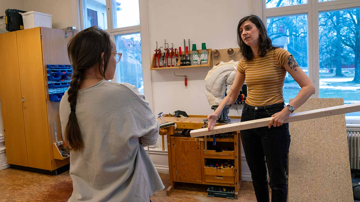 Karolina, till höger, i ateljésamtal med en deltagare på det fristående fördjupningsåret.